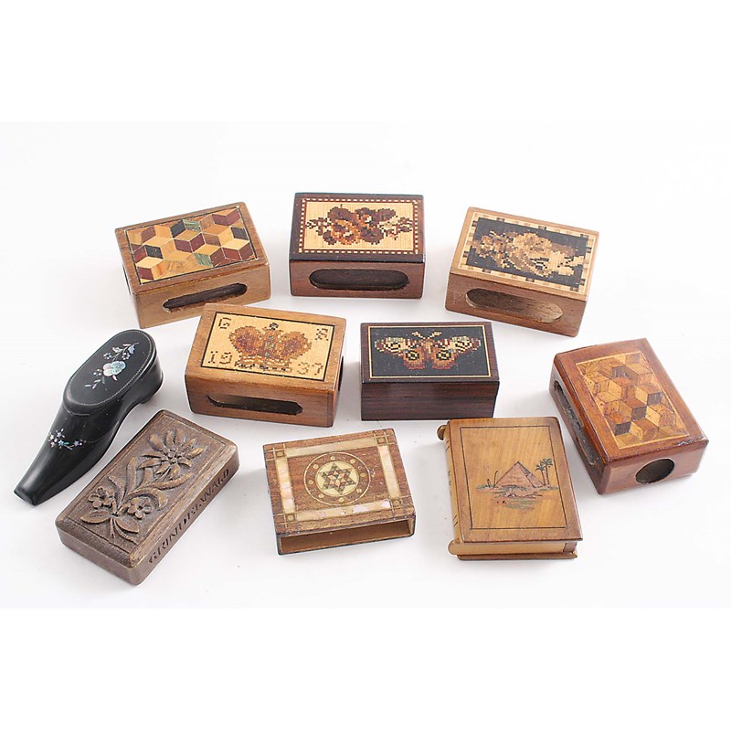 SEVEN VARIOUS TONBRIDGE-WARE OR PARQUETRY MATCH BOX COVERS, an olive-wood vesta case, a carved wooden vesta case inscribed "GRINDELWALD" and a Victorian papier-mache shoe vesta case; the latter 3.2" (8 cms) long (10)
