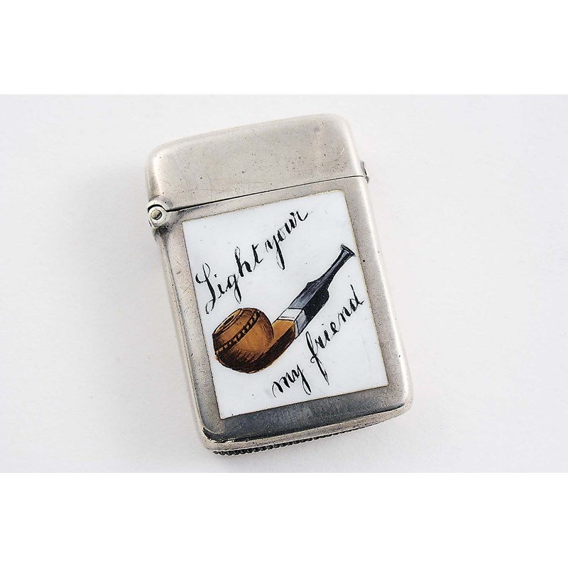 enamelled on the front "Light your (pipe) my friend", by D&L Spiers, Birmingham 1887; 1.6" (4 cms) long; 0.4 oz