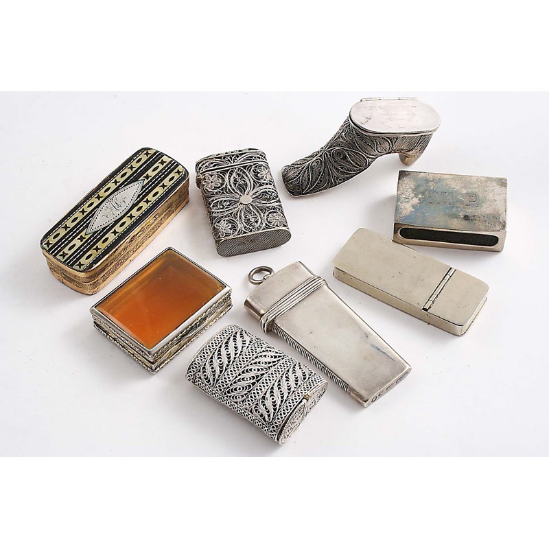 (one in the form of a boot), a silver vesta case, initialled "W.L.P", an Italian silver box with a resin cover, a silver phleam case with an added striker area, and two other non-precious boxes; the boot vesta 2.6" (6.5 cms) long (8)