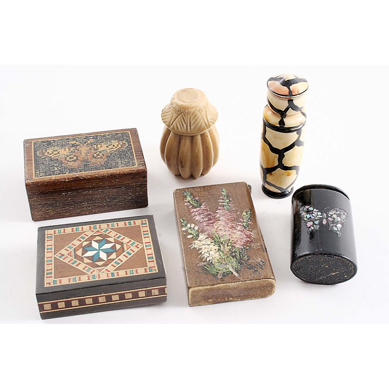 A LATE 19TH CENTURY PAINTED & TURNED IVORY VESTA CASE in the form of a vase, a carved nut vesta case, a papier-mache vesta case and three wooden vesta cases; the ivory example 2.75" (7 cms) high (6)