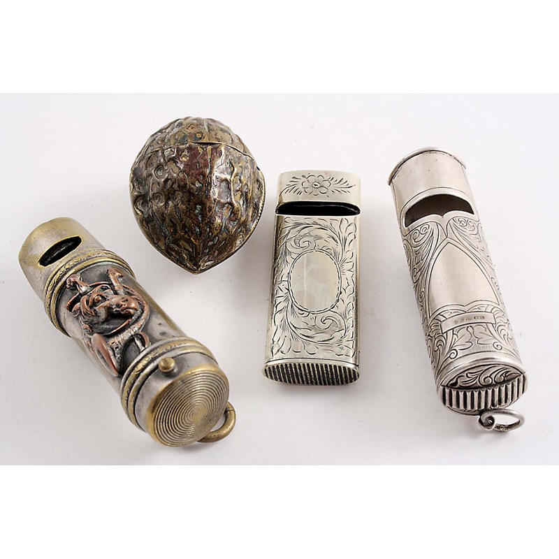 import marked London 1975, two late 19th century plated whistle vesta cases & a brass "walnut" vesta case; the latter 1.55" (4 cms) long; 0.65 oz weighable silver (4)