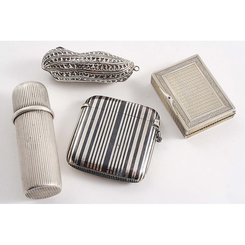with striped decoration, unmarked, a French silver engine-turned vesta case with a sprung cover, a gem-set thumb piece, a Continental silver vesta case of reeded tubular form and a modern silver "peanut" vesta case; the latter 2" (5 cms) long; 2.9 oz (4)