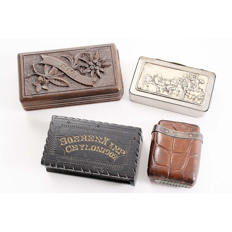 A carved hardwood vesta case inscribed "BOERENKAMP CEYLON 1902", a carved wood "trick opening" vesta case inscribed "RIGI" (can only be opened by pressing the end when inverted), a late Victorian silver mounted crocodile leather vesta case and a nickel-plated "puzzle-opening" vesta case with a resin, peasant scene on the cover; the latter 2.2" (5.5 cms) long (4)