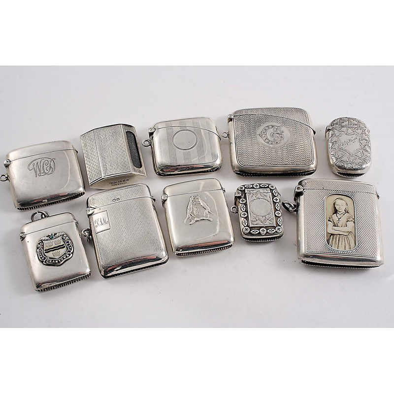 TEN VARIOUS LATE VICTORIAN/EDWARDIAN/EARLY 20TH CENTURY SILVER VESTA CASES (some with initials or dedications), including one with the enamelled arms of Grantown on Spey; the latter 2" (5 cms) long; 8.5 oz (10)