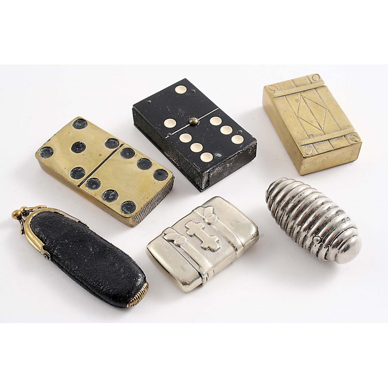 a vulcanite domino vesta case, a brass packing case vesta case, a nickel piece of luggage vesta case, a leather purse vesta case and an oviform plated vesta with ring fluting; the latter 1.75" (4.5 cms) long (6)