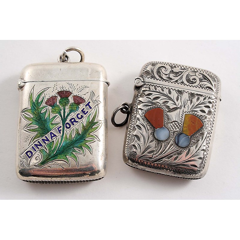 enamelled and engraved on the front with thistles and "DINNA FORGET", probably by J. Cook & Son, Birmingham 1905 and another engraved silver example inset with agate thistle heads, the reverse monogrammed, maker's mark "WHL", Birmingham 1906; the latter 1.75" (4.4 cms) long; 1.7 oz (2)