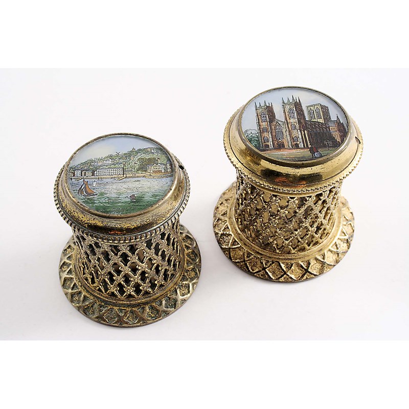 the cover inset with a coloured and highlighted printed image of "York Minster" (behind glass), and another similar example with a view of "West Cowes" (both with "go to bed" facility), each c.1850; the latter 2" (5.3 cms) high (2)
