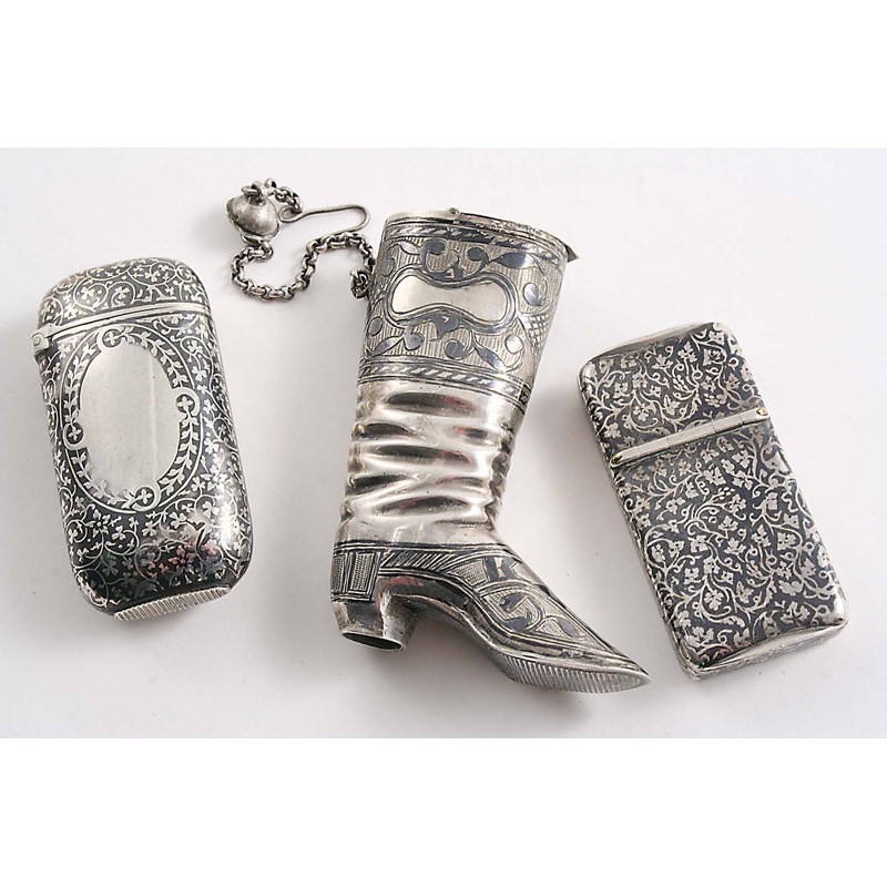 A LATE 19TH / EARLY 20TH CENTURY RUSSIAN PROVINCIAL SILVER & NIELLOWORK VESTA CASE & SLOW MATCH HOLDER in the form of a boot, a French silver & niellowork "tinderbox" type vesta case and an Austro-Hungarian silver & niellowork vesta case, Vienna c.1900; the boot 2.4" (6.1 cms) long; 1.9 oz (3)