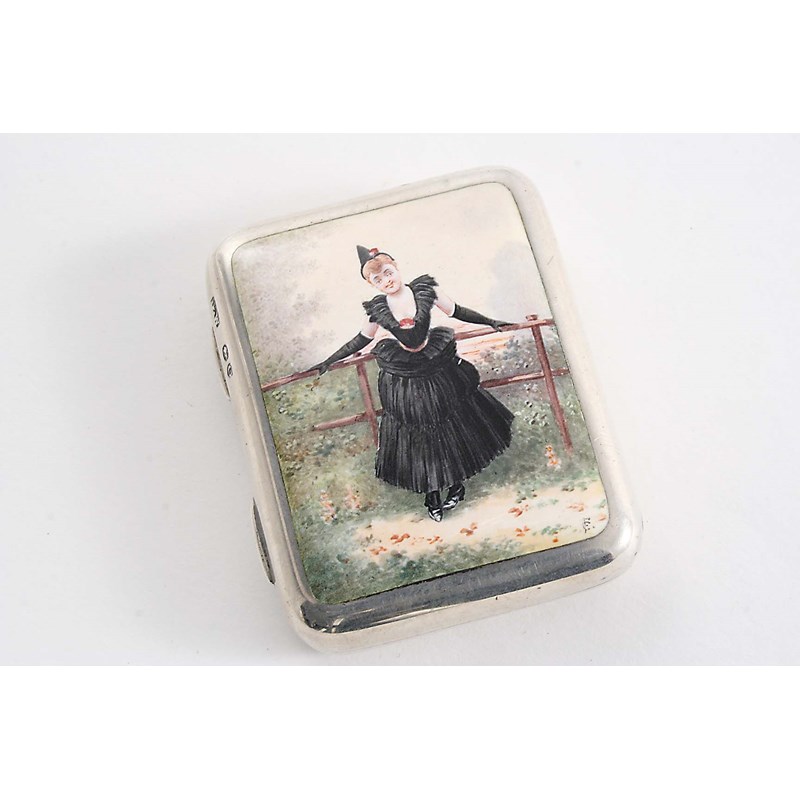 enamelled on the front with a young lady in a black dress leaning on a wooden fence, gilt interior, by George Wilkinson, London 1889; 2.2" (5.5 cms) long; 1.55 oz