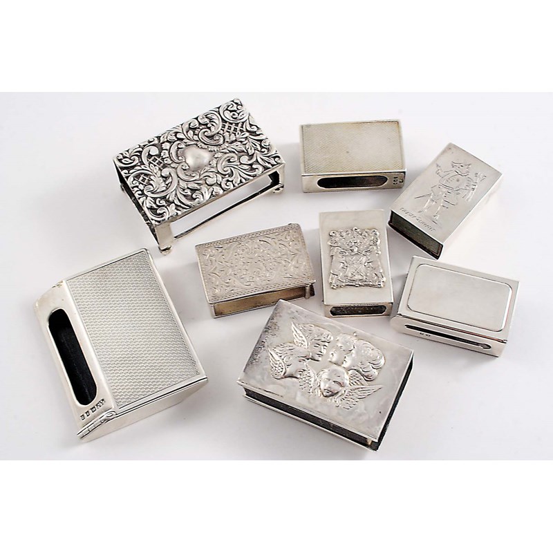 EIGHT VARIOUS SILVER MATCH BOX HOLDERS