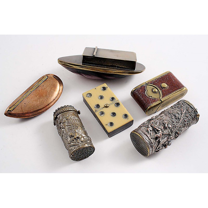 tubular with a romantic figural scene around the sides, another similar plated vesta case with a red glass boss on top, a brass mounted mussel-shell vesta case, a copper mounted mussel shell vesta case, a resin domino vesta case and a brass & leather camera case vesta case; the latter 1.9" (4.7 cms) long (6)