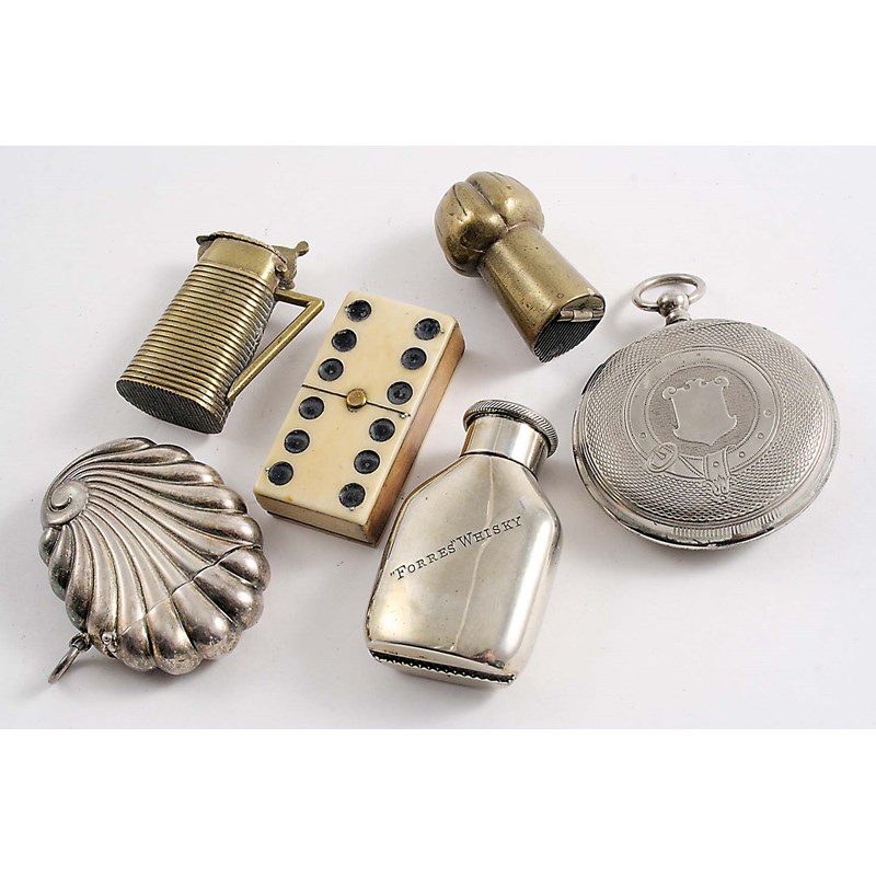 resembling a fluted shell, another plated example resembling a pocket watch, a plated "FORRES WHISKY" bottle vesta case with "Morton's patent" closure, an ivory domino vesta case & two other brass vesta cases; the bottle vesta 2" (5 cms) long (6)