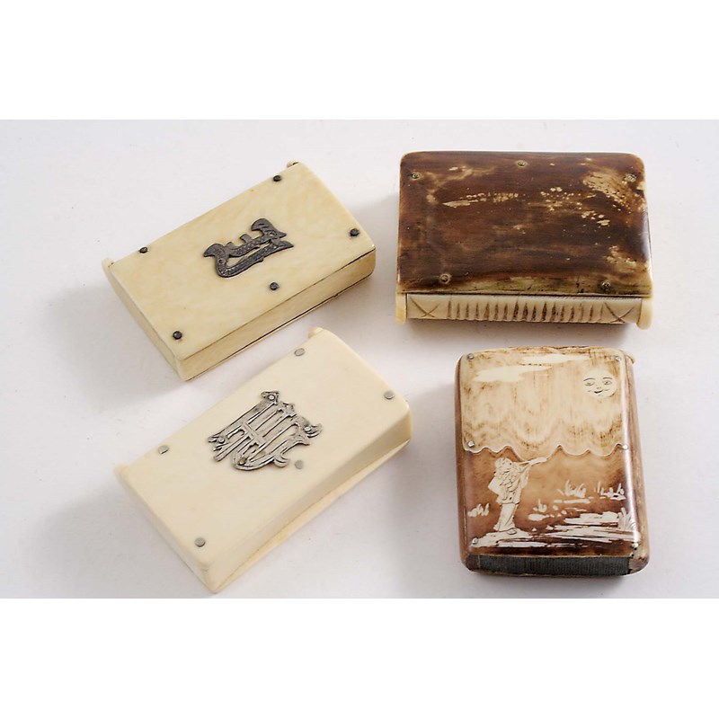 with staining and an engraved scene with Pierrot and the sun, another similar with no scene and two other late 19th century ivory vesta cases with applied silver initials; the larger one 1.8" (4.2 cms) long (4)