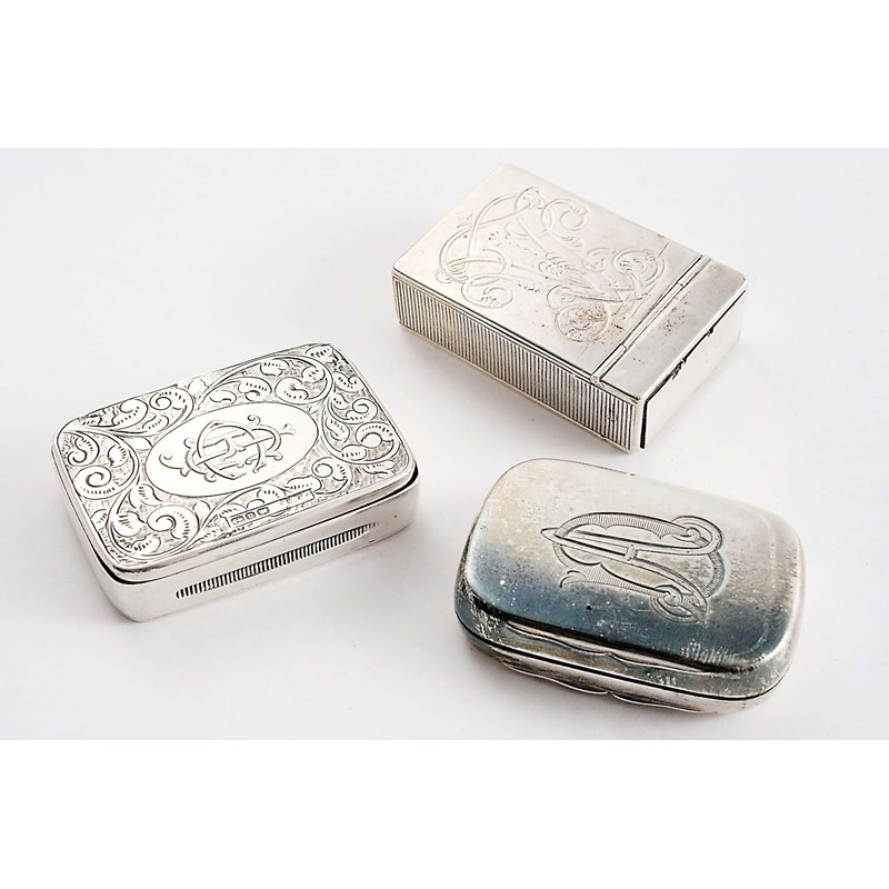 with scroll engraving and a central monogram, by J.M. Banks, Birmingham 1894, together with two other late Victorian silver vesta cases (one with a cypher, one with a monogram); the largest one 2" (5 cms) long; 3.3 oz (3)