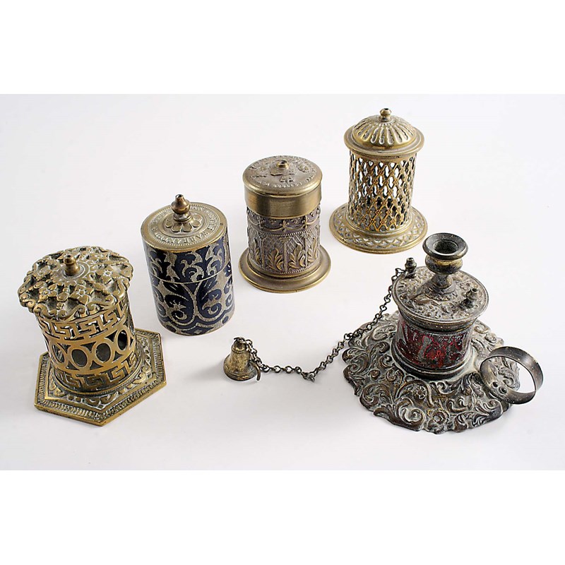 with "go to bed" facility, a brass "go to bed" vesta with lacquered decoration stamped "Patent Wax Vestas Warranted", another brass "go to bed" in the form of a chamberstick, and two others with pierced sides; the largest one 2.7" (6.6 cms) high (5)