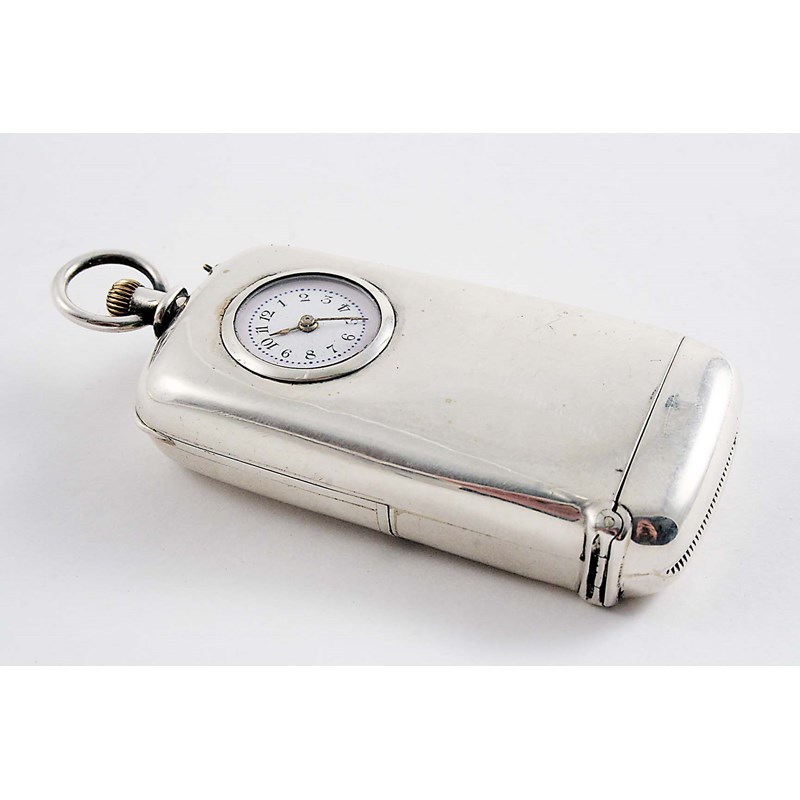 A LATE VICTORIAN SILVER COMBINED VESTA CASE, TIME PIECE & SOVEREIGN CASE of plain rounded oblong form, gilt interiors, by W. Neale, Birmingham 1887; 3" (7.5 cms) long; 1.8 oz gross