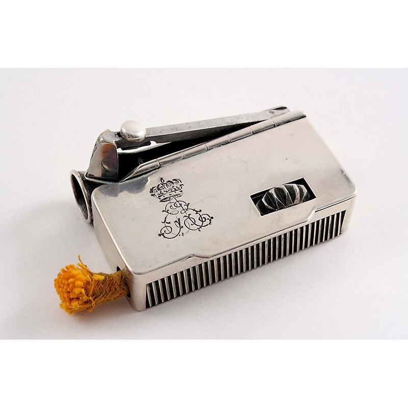A LATE 19TH CENTURY AUSTRO-HUNGARIAN SILVER VESTA CASE, SLOW MATCH HOLDER & CIGAR CUTTER COMBINED, rectangular with an engraved cypher and coronet on the cover, maker's mark "AH", Vienna c.1880; 2.1" (5.5 cms) long; 2.3 oz