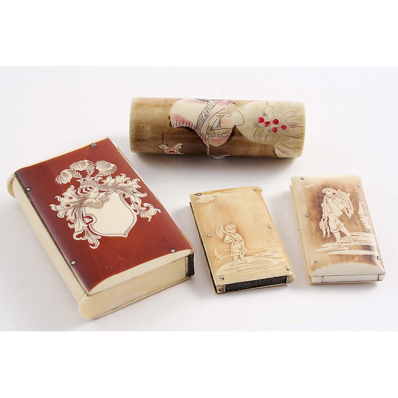 A LATE 19TH / EARLY 20TH CENTURY FRENCH "DIEPPE" IVORY VESTA CASE with a little fisher girl on the front, another similar example inscribed "Wimereux" on the reverse, another cylindrical example painted with a young girl & flowers and a larger, stained example with an engraved shield cartouche; the latter 2.4" (6 cms) long (4)