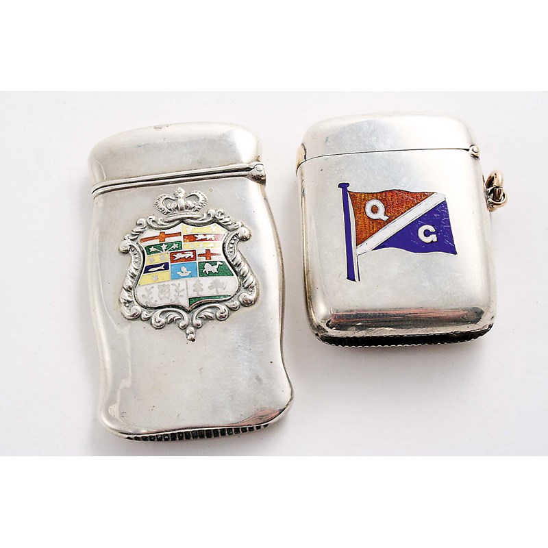 enamelled on the front with the arms of the Canadian Provinces, the reverse inscribed and a late Victorian silver vesta case with applied gold detail bud on enamelled flag on one side with the intials "Q" and "G", by Horton & Allday, Birmingham 1894; the latter 2" (5 cms) long; 1.8 oz (2)