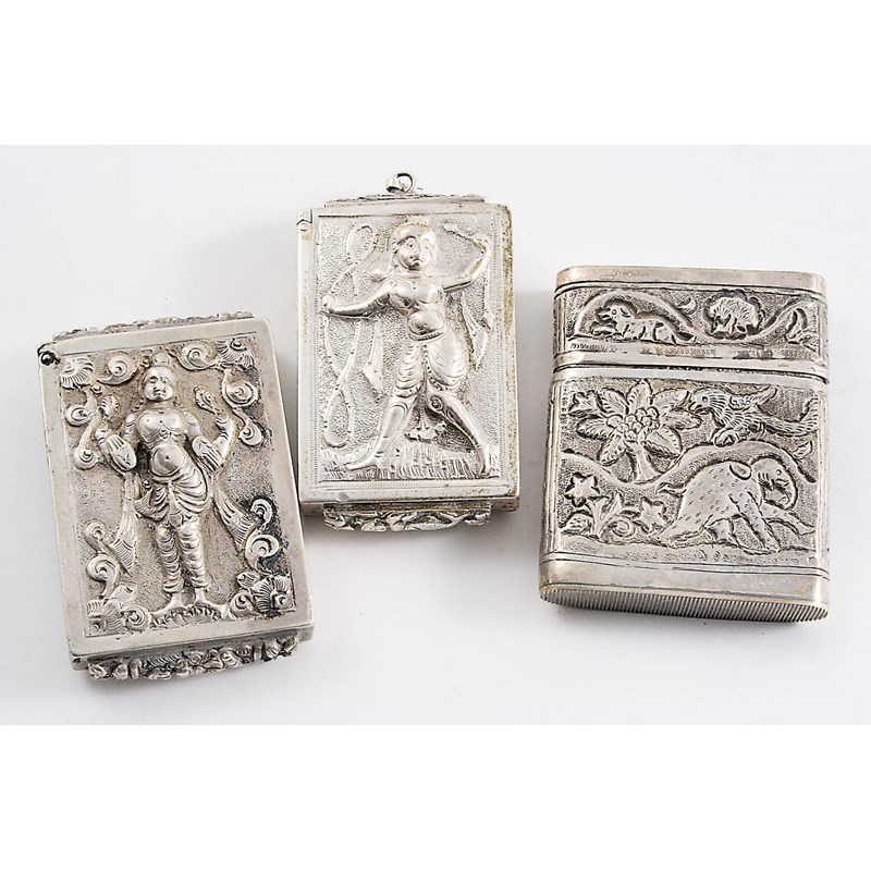 THREE EARLY 20TH CENTURY INDIAN SILVER VESTA CASES the largest one 2.25" (5.7 cms) long; 4.2 oz (3)