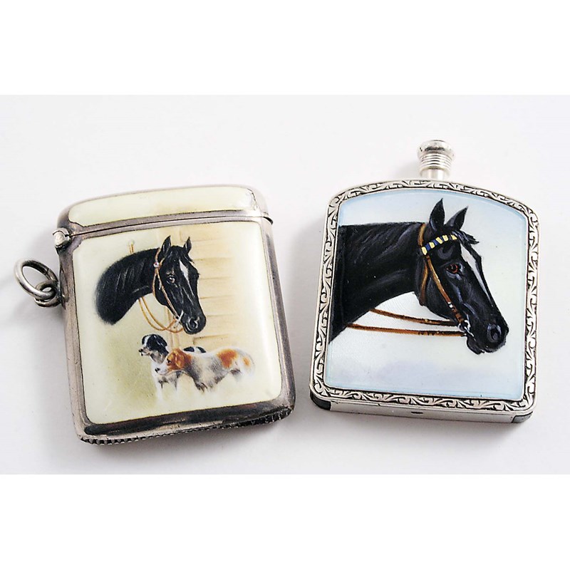 AN EARLY 20TH CENTURY CONTINENTAL SILVER & ENAMELLED VESTA CASE with a horse and hands in a stable on the front, struck with French duty marks, c.1910 & a Continental silver spark striker enamelled with the head of a racehorse, with import marks for London 1924; the latter 1.9" (5 cms) long; 1.8 oz (2)