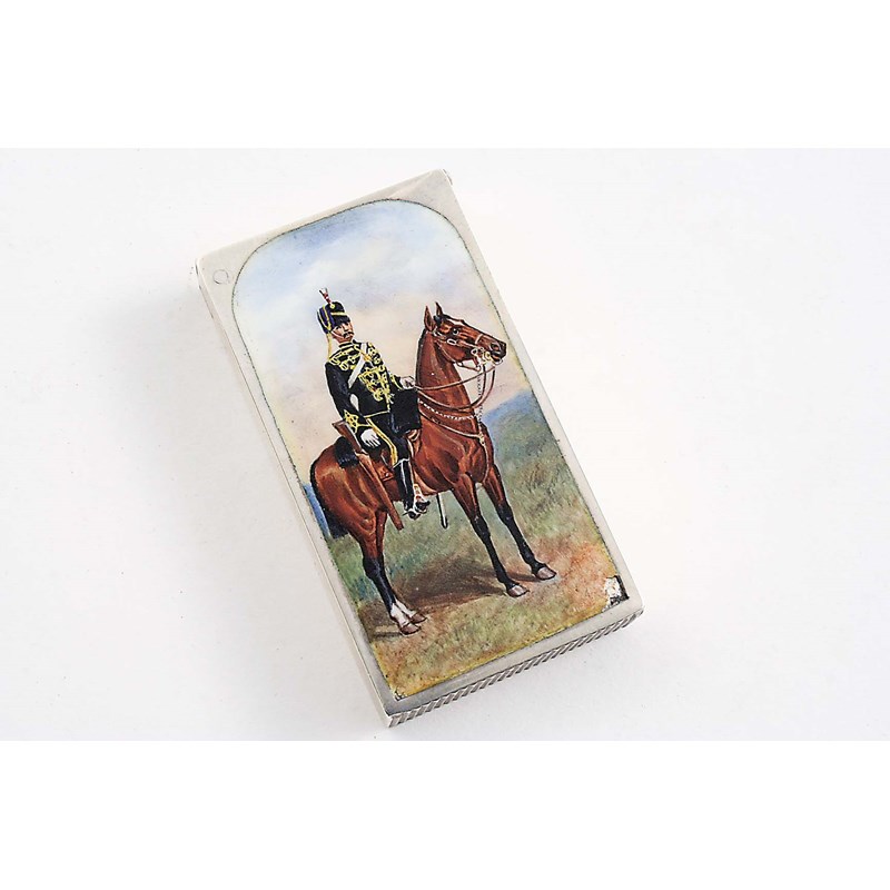 Enamelled with a mounted Hussar in a hilly landscape, by Sampton Mordan & Co., London 1892; 2.25" (5.7 cms) long; 1.35 oz