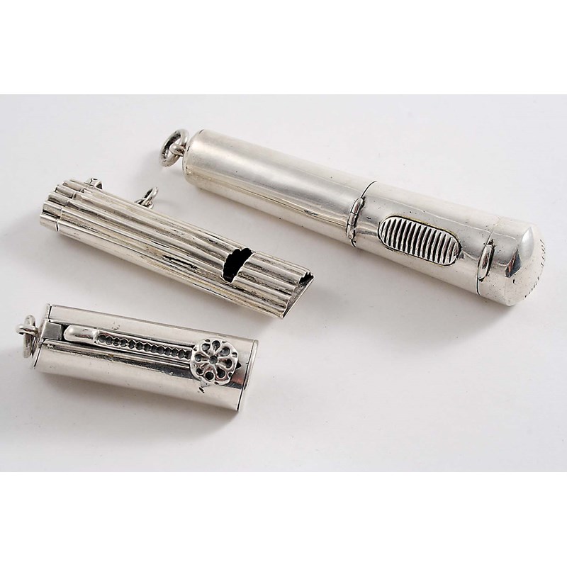By Sampson Mordan, London 1886, a fluted silver vesta case & whistle, maker's mark worn, Birmingham 1888 and a silver vesta case and cheroot holder, by H.J. Cooper & Co.Ltd., Birmingham 1897; the latter 3.75" (9.5 cms) long; 2 oz (3)