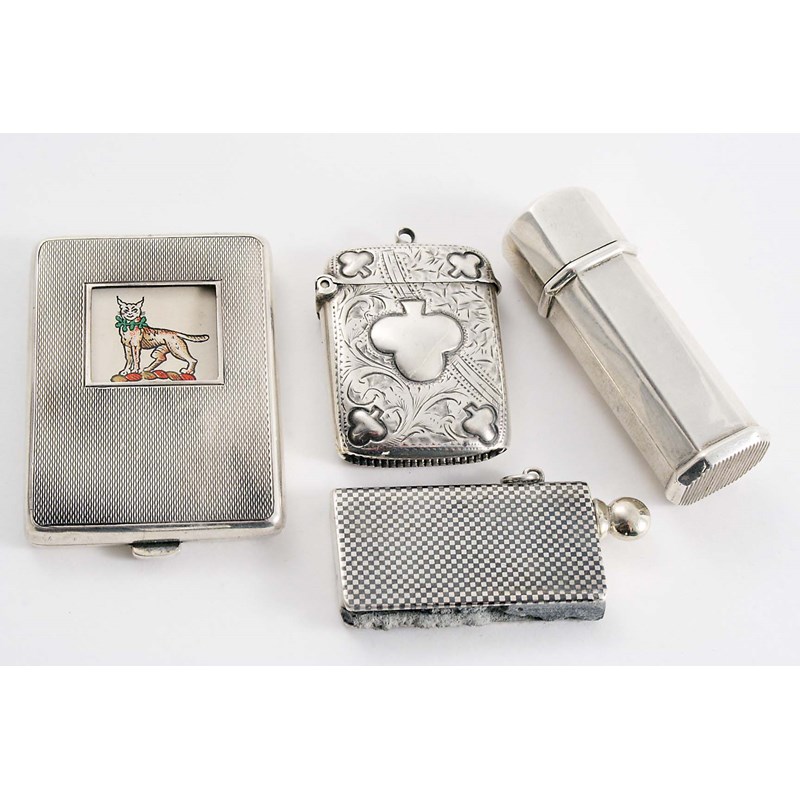 With a pull-off cover, by Sampson Mordan & Co., Chester 1909, a silver book match holder with an aperture each side, London 1934, an engraved vesta case, loosely resembling the five of clubs card, Chester 1904 and a silver & niellowork spark striker; the Mordan vesta case 2.5" (6.2 cms) high; 3.2 oz (4)