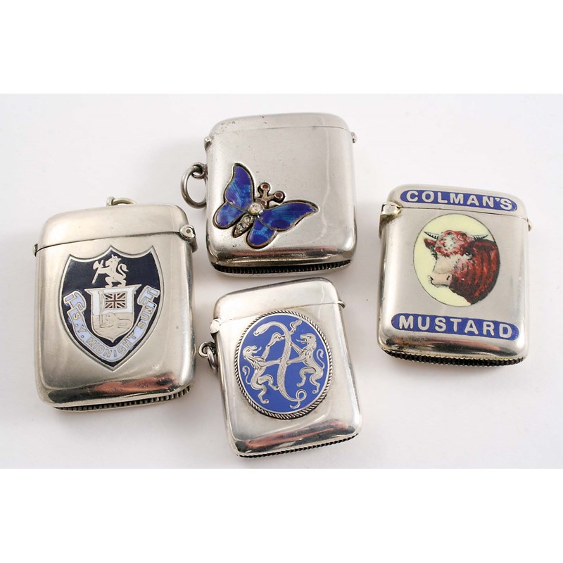 FOUR EARLY 20TH CENTURY PLATED & ENAMELLED VESTAS:-