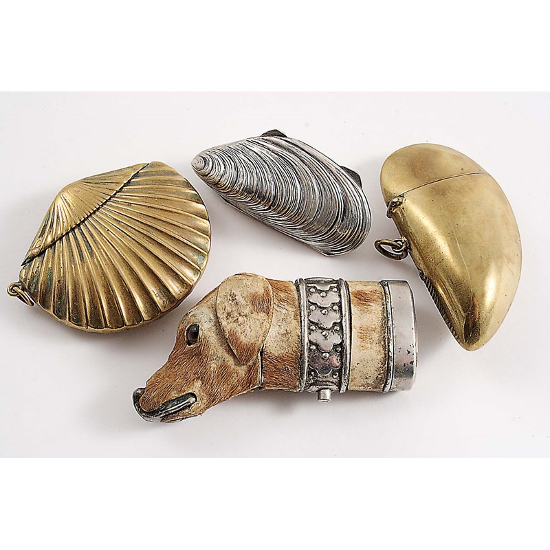 an early 20th century brass mussel shell vesta case, another brass shell vesta case and a nickel-plated and fur-covered vesta case in the form of the head & neck of a hound, c.1890; the latter 2.8" (7.2 cms) long (4)