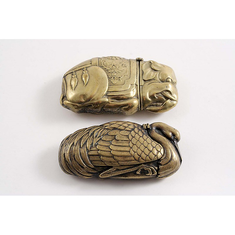 in the form of a recumbent working elephant and another brass vesta in the form of a crane in a similar pose; the latter 2.5" (6.5 cms) long (2)