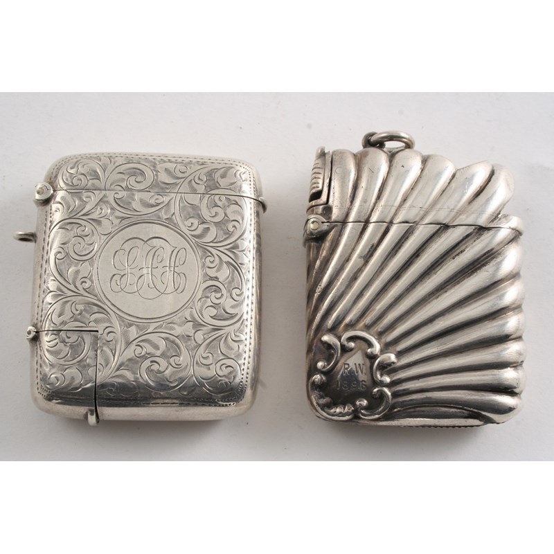 A LATE VICTORIAN SILVER "UNITY PATENT" VESTA CASE & CIGAR CUTTER COMBINED, with rayed fluting and a small cartouche initialled "RW" & dated "1896", by Horton & Allday, Birmingham 1895 and a scroll-engraved silver vesta case with an extra compartment containing a cheroot holder, initialled, by W.H. Haseler, Birmingham 1907; each approx. 2.2" (5.5 cms) long; 2.8 oz (2)