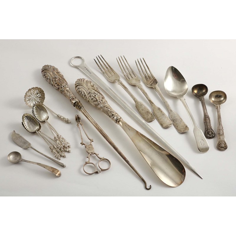 A George III meat skewer by Richard Crossley, London 1788, a pair of George III sugar nips, initialled, a late Victorian mounted steel shoe horn & button hook with embossed handles, a set of six late Victorian tea spoons and a matching sugar sifter spoon with figure terminals, and eight other various small items of flatware; the skewer 13.25" (33.5 cms) long; 13 oz weighable silver (lot)