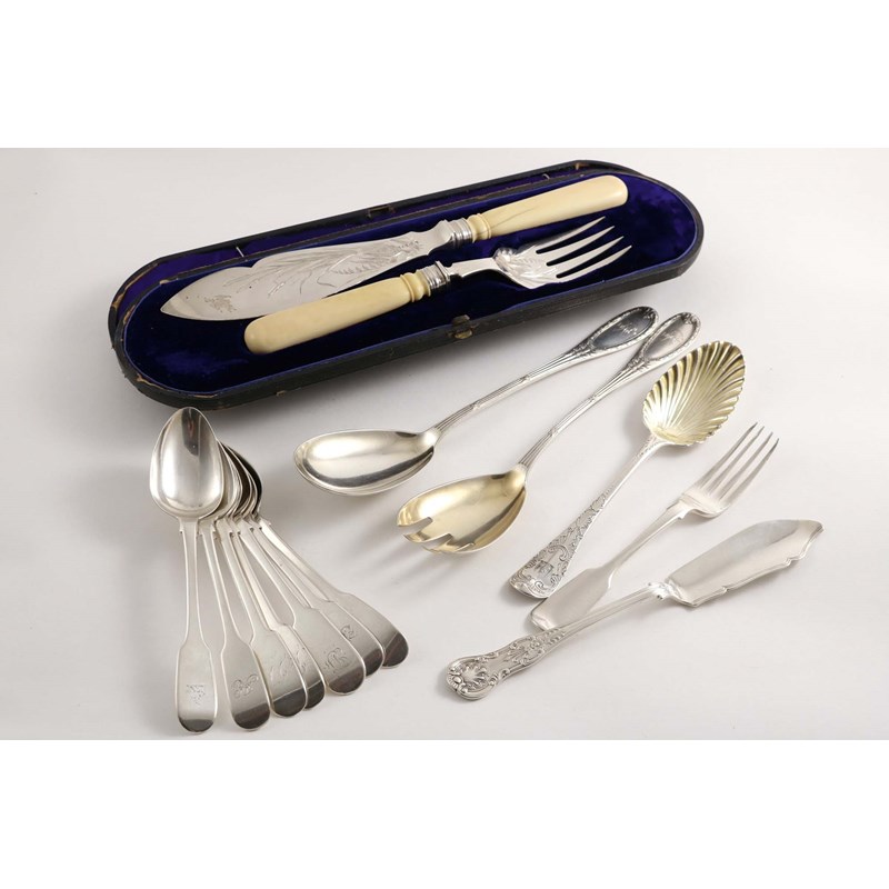 To include seven various antique Fiddle pattern dessert spoons (all either crested or initialled, except one), a pair of Continental salad servers, monogrammed, a butter knife, a dessert fork, both initialled, a George II later-decorated table spoons, crested, and a cased pair of Victorian engraved fish servers with ivory handles; the fish knife 11.8" (30 cms) long; 20.3 oz weighable silver (13)