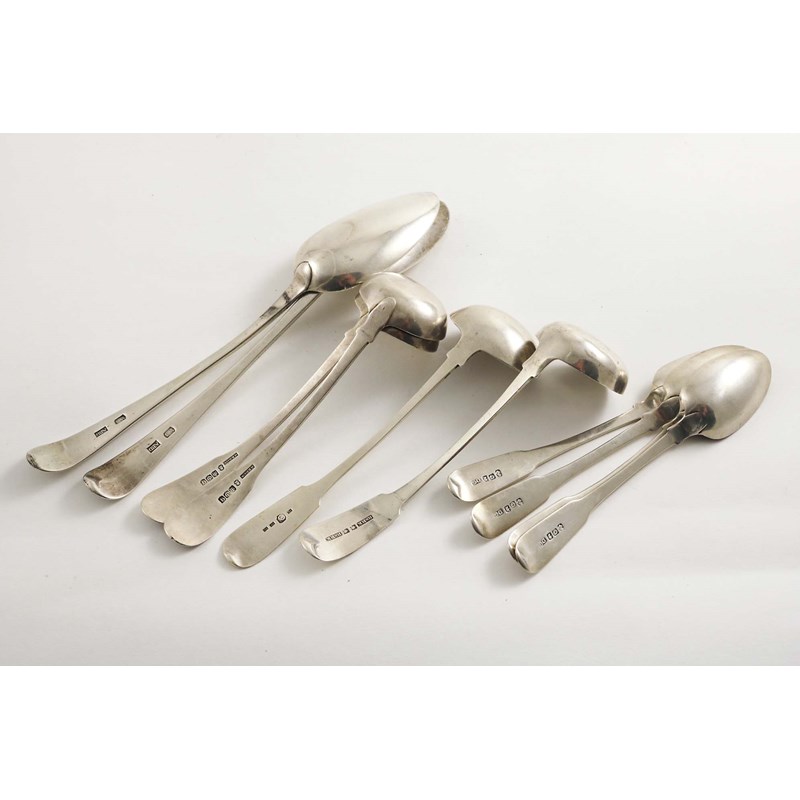 a Fiddle toddy ladle, initialled, by R & R Keay of Perth (R&RK, twice and double headed eagle, twice) and a set of four Fiddle tea spoons, initialled "H", by David Gray of Dumfries (fouled anchor, G, unicorn's head & DG); 10 oz (10)