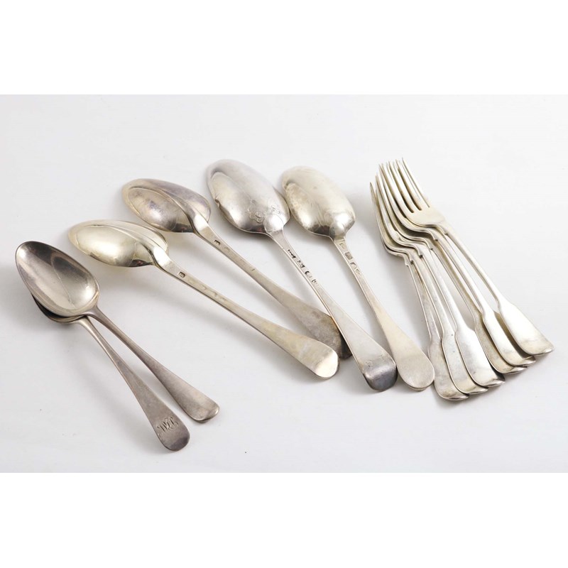 A set of six William IV Fiddle pattern dessert forks, crested, by Mary Chawner, London 1834, a George II table spoon, a George III fancy-back table spoon, initialled, a George III dessert spoon, initialled, a George II dessert spoon, crested, and a pair of George I provincial rattail table spoons by Francis Batty of Newcastle c.1725 (marks quite worn); 15.8 oz (12)