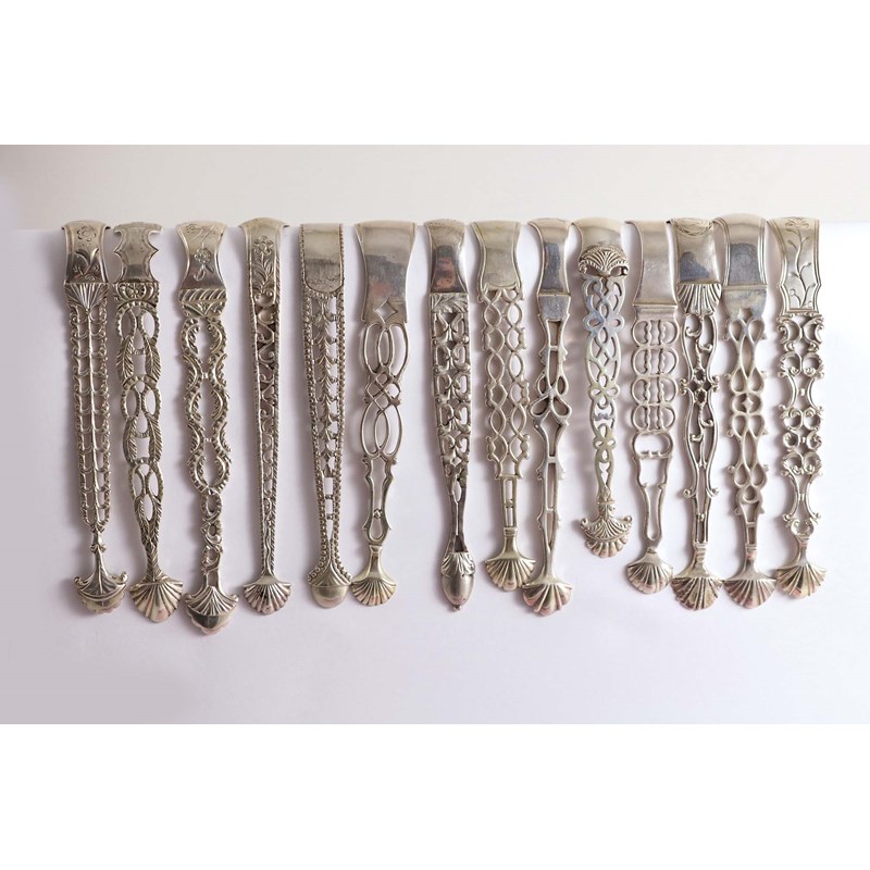 CAST & PIERCED ARMS:- Fourteen various pairs of George III sugar tongs, mixed makers & dates, all London-made (all but one pair either crested or initialled); 16.5 oz (14)