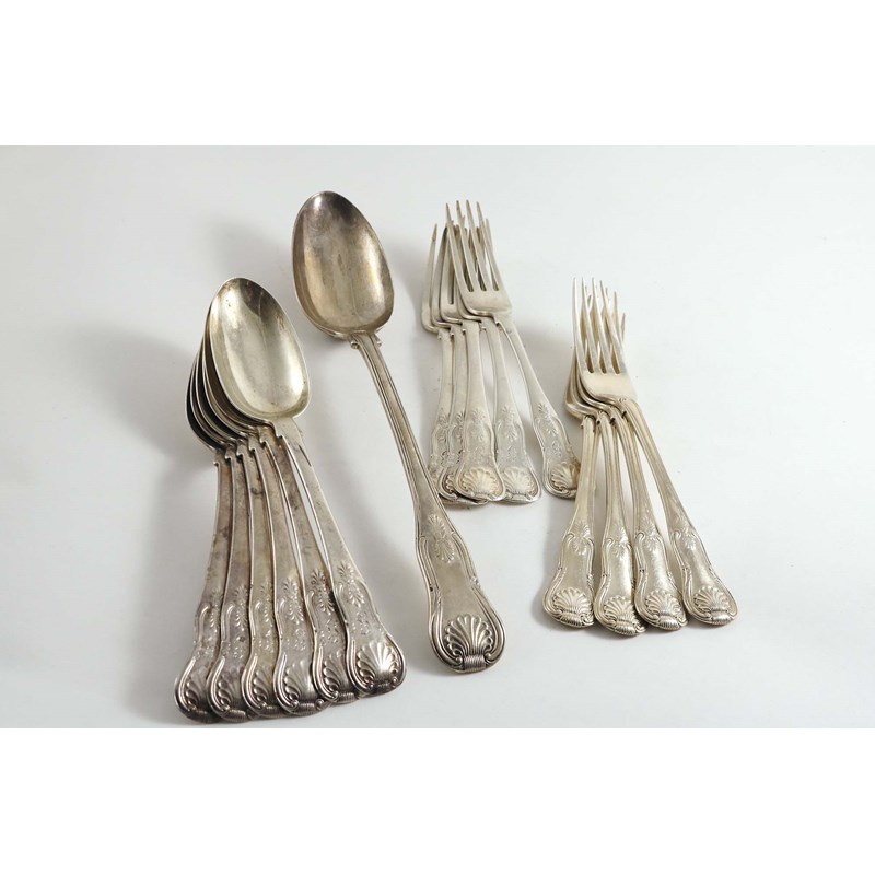 A George IV bsting spoon (with Union Shell heel), by Robert Peppin, London 1824, a set of four Irish table forks (also with Union Shell heel), a matched set of six Scottish (single struck with shoulders) table spoons and five table forks, all initialled "G", by J & W Marshall, Edinburgh 1830/31/32 with two different retailer's marks; 44.9 oz (16)