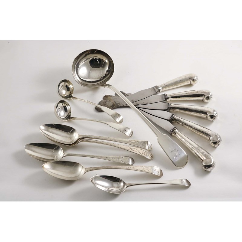 An early Victorian Fiddle pattern soup ladle, crested, maker's mark "IB", London 1839, a pair of Scottish toddy ladles, Fiddle pattern, initialled, maker's mark "JN", Glasgow 1823, a set of five George II/III table knives with pistol handles and steel blades, crested, four George III bright-cut table spoons, initialled, and a dessert spoon, initialled by Peter & Anne Bateman, London 1796; the soup ladle 13" (33.5 cms) long; 16.8 oz weighable silver (13)