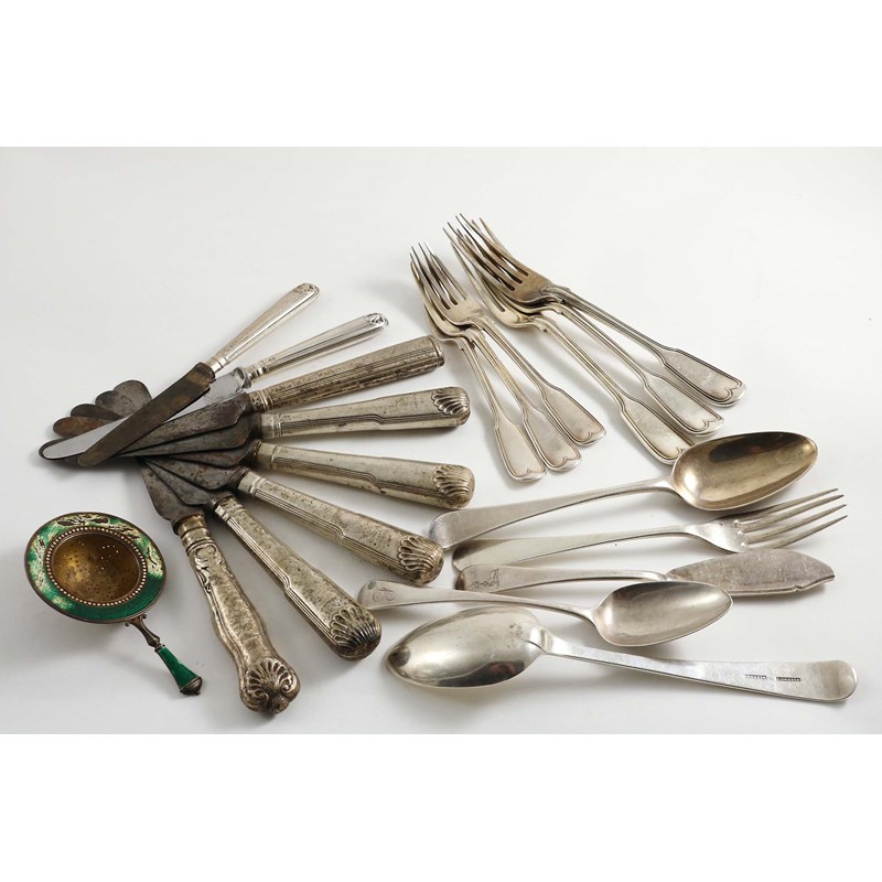 A set of three Victorian Fiddle & thread pattern table forks and three dessert forks, crested, by Mary Chawner, London 1838, a George III butter knife, crested, a George III table spoon, a dessert spoon, a Portuguese table fork, a Norwegian tea strainer (A/F), six antique table knives and two later side knives (steel blades) and a Colonial table spoon, maker's mark only "I.BERTIE" (struck twice), unascribed, 1800-1840; 22.8 oz weighable silver (20)