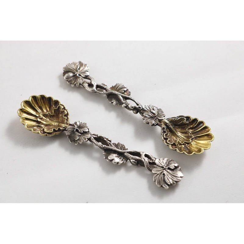 A PAIR OF 19TH CENTURY CAST NATURALISTIC SALT SPOONS with openwork, leafy stems & gilt bowls, maker's mark only "E.T", unascribed, probably dating from 1830-1860; 3.75" (9.5 cms) long; 1.25 oz (2)