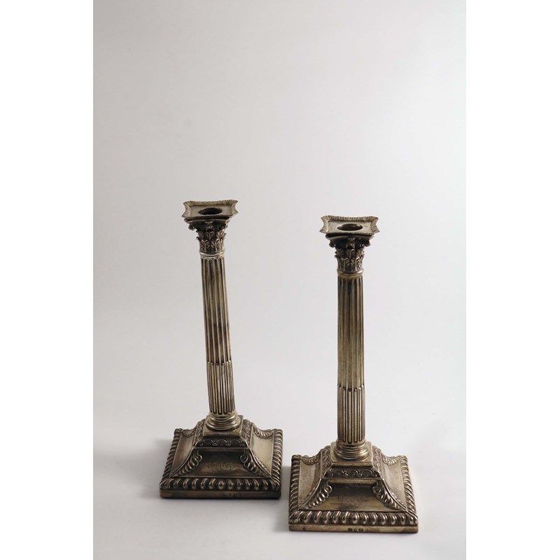 A PAIR OF GEORGE III COLUMN CANDLESTICKS with Corinthian capitals on bevelled square bases, decorated with gadrooning and debased foliage, initialled, by William Abdy,London 1767 (loaded bases); 11.75" (30 cms) high (2)
