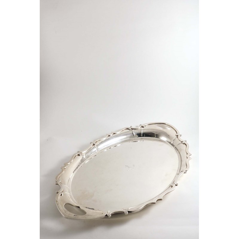 of shaped oval outline with an applied scroll border, button feet and a central, engraved crest, by the Goldsmiths & Silversmiths Co.Ltd., London 1904; 24.6" (62.5 cms) long; 88.5 oz