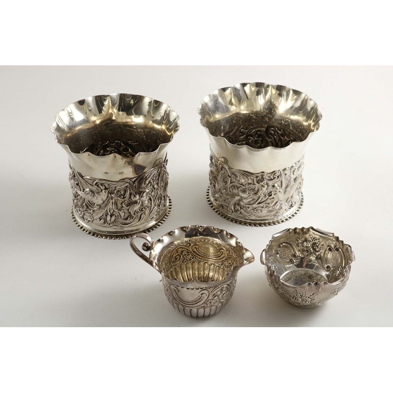 with shaped and flaring rims, by William Comyns, London 1891 together with an embossed cream jug & a small sugar bowl; the planters 3.7" (9.5 cms) high; 13.4 oz (4)