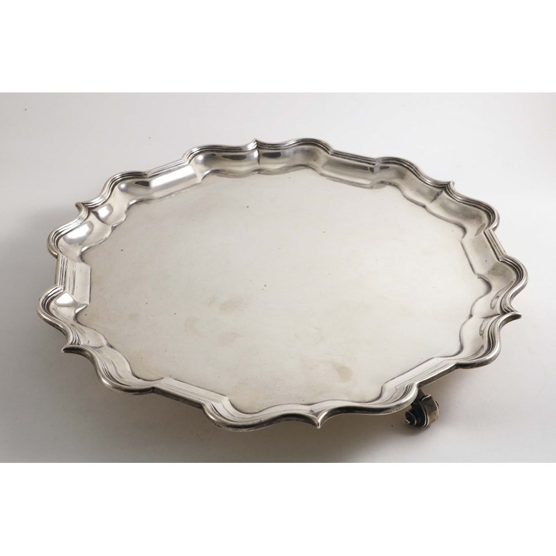 of shaped circular outline with a moulded border and large scroll feet, by H. Lambert (of Coventry Street), London 1904; 1.45" (37 cms) diameter; 54 oz