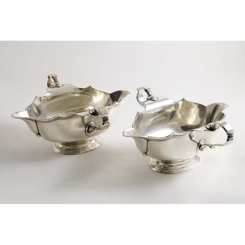 A PAIR OF EARLY 20TH CENTURY DOUBLE-LIPPED SAUCE BOATS on spreading oval bases, with shaped and moulded rims, by Richard Comyns, London 1934; 8" (20 cms) long; 28.5 oz (2)