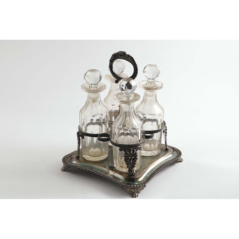 of shaped square outline with paw feet, a gadrooned border & a decorative ring handle fitted with four cut-glass stoppered bottles, by Charles Fox, London 1822; 7.25" (18.5 cms) high; 10.8 oz weighable silver