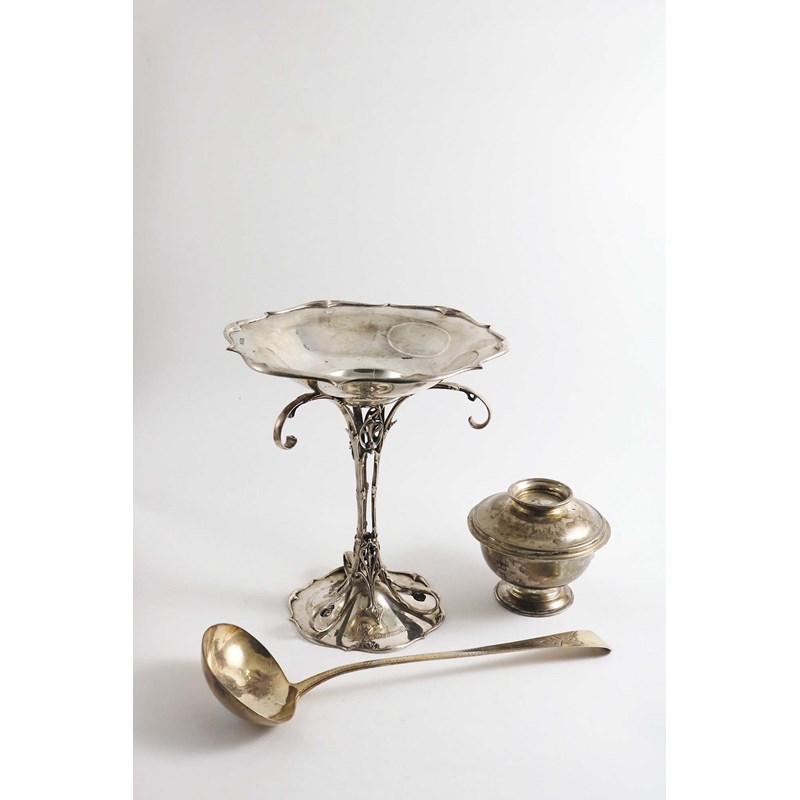 An early 20th century Art Nouveau epergne, lacking its baskets, inscribed, by G. Howson, Sheffield 1911, an Edwardian Britannia-Standard sugar bowl & cover, initialled and dated "1905" by Messrs. Jay, Chester 1904 and a George III soup ladle with an engraved stem, initialled, by S. Hougham, London 1799; the epergne 9.3" (23.5 cms) high; 35.7 oz (3)