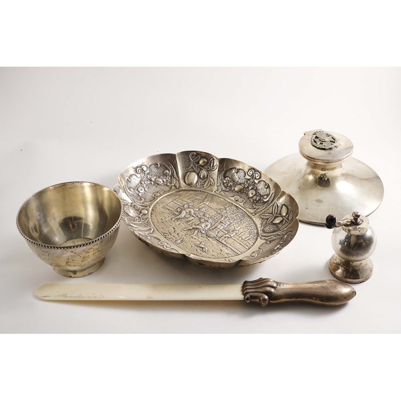A late Victorian mounted ivory paper turner, a mounted glass pepper mill, a Continental embossed dish with figures in the centre, a Continental sugar bowl with a beaded rim, and an early 20th century capstan inkwell with an applied Rifle Brigade badge (glass liner); the latter 7" (18 cms) diameter; 16 oz weighable silver (5)
