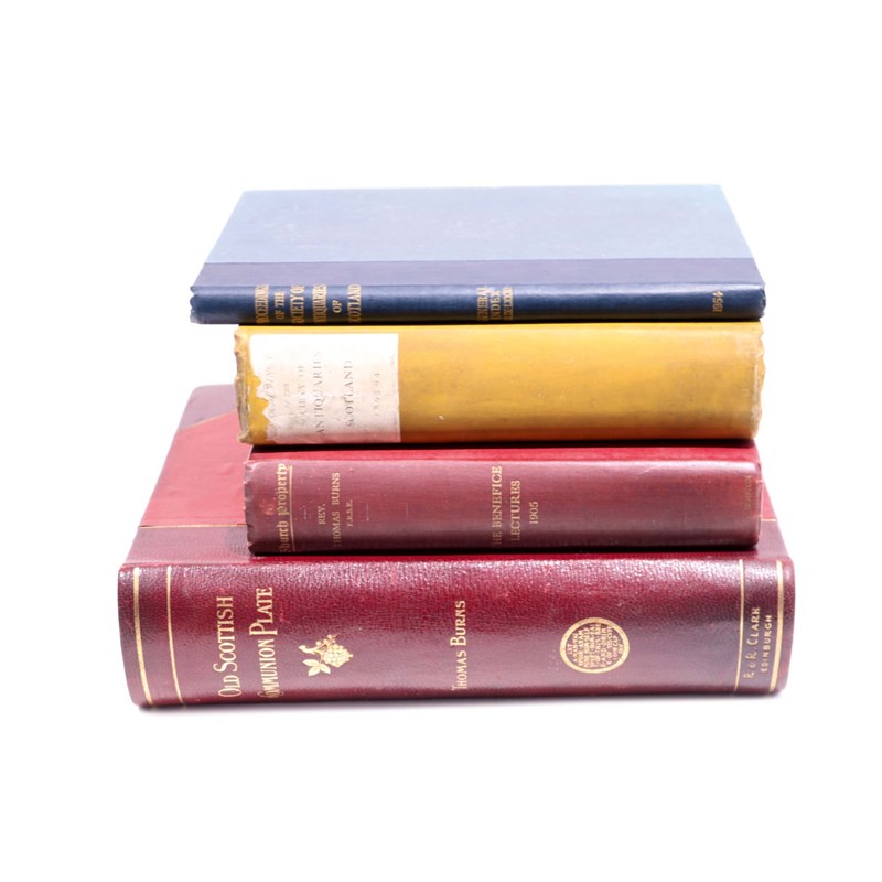 Bound Proceedings of the Society of Antiquairies of Scotland (1893-94, 1933-34, 1934-35, General Index 1954, General Index 1968, Indeces 1947-48 & 1972-74, 1969-70, 1971-72 & 1988) together with Burns, the Revd Thomas: Old Scottish Communion Plate, Edinburgh 1892 and The Benefice Lectures, 1905 by the same author (lot)
